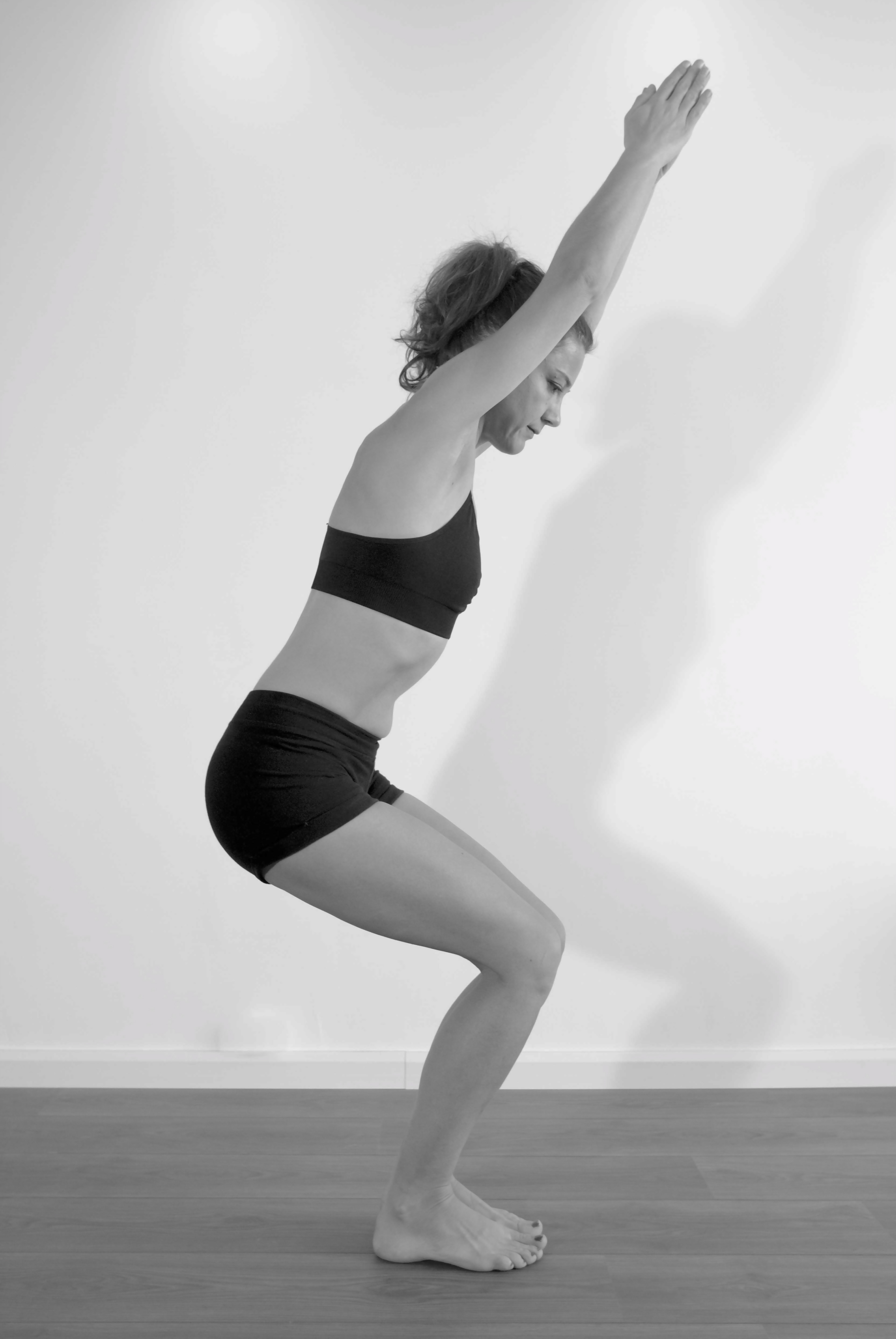 Utkatasana- Chaise *effets : renforcement des cuisses, des fessiers, du dos et des abdos – étirement du dos – /énergie dans le bas du dos et organes génitaux * focus : ne pas cambrer – abdos engagés – ventre rentré – dos étiré.