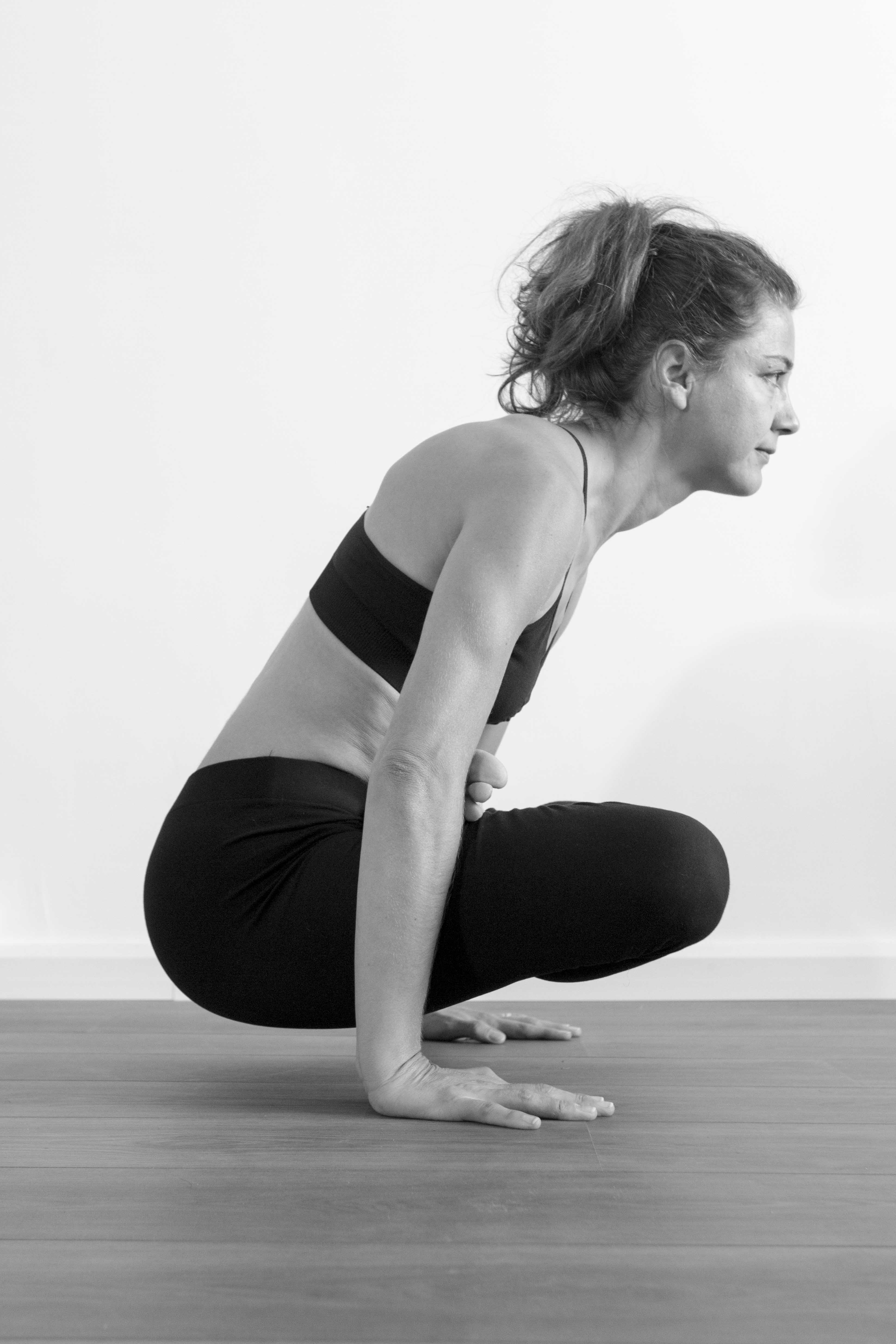 * variante : pour une variante plus facile on peut faire la posture en demi lotus (un seul pied sur la cuisse) et mettre les mains sur des blocs – il est possible également de maintenir la posture statique ou de se balancer d’avant en arrière.