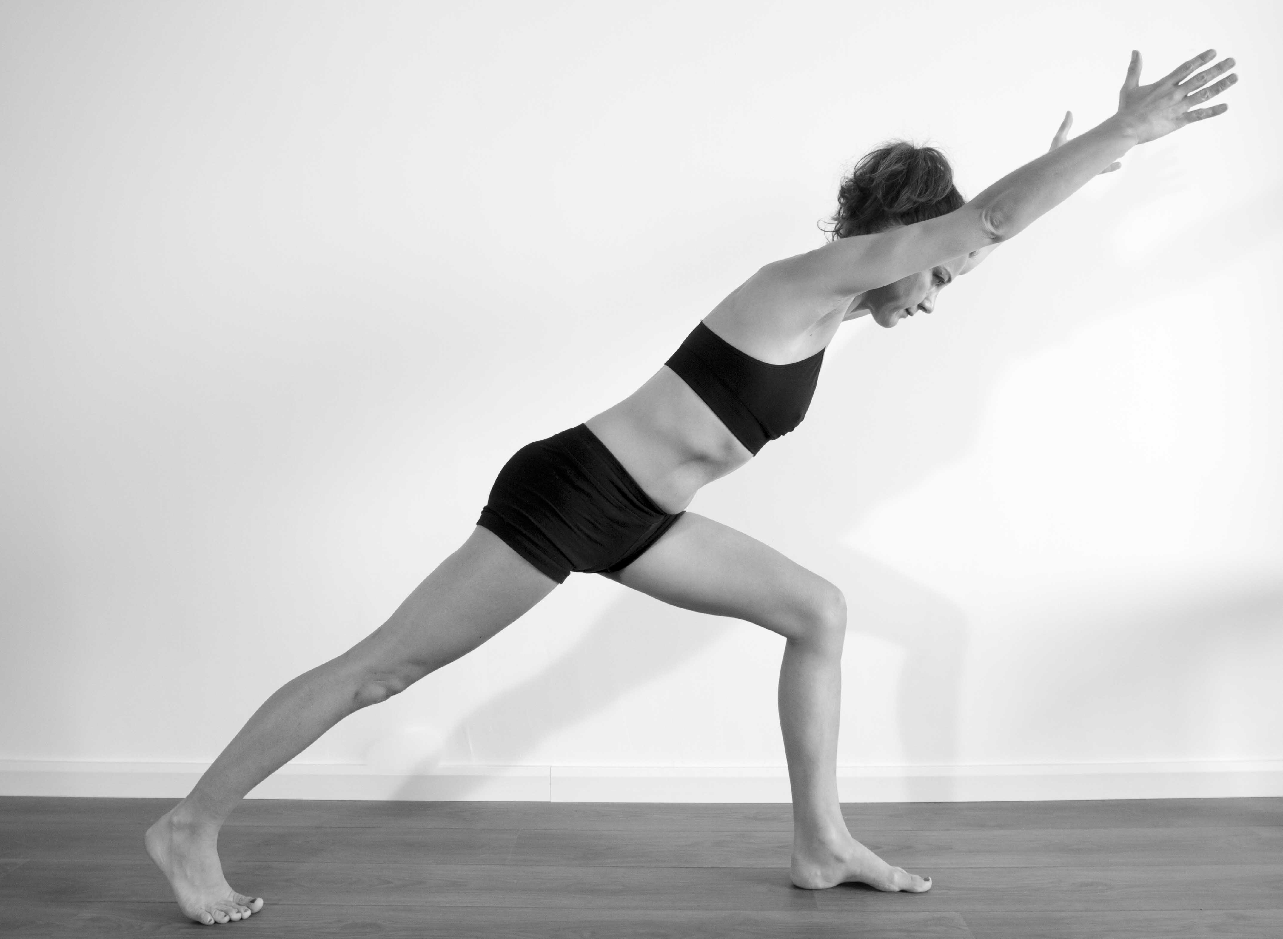 virabhadrasana I (variante ) – guerrier I * effets : renfocement des jambes, du dos et des abdos * focus : alignement de tout le corps – abdos engagés