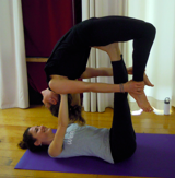 C’est une pratique ludique inspirée donc du Yoga, du massage thaï et de l’acrobatie qui se pratique avec des partenaires. Cette pratique développe l’équilibre, la confiance en soi et en l’autre, l’écoute mutuelle et offre une large gamme d’effets thérapeutiques, de renforcement musculaire et de sensations joyeuses et stimulantes en toute sécurité grâce à la présence des partenaires! L‘AcroYoga reprend une multitude de postures du yoga en les adaptant à la pratique. Comme le yoga, l’AcroYoga demande et développe la concentration sur le moment présent, sur son corps et sur sa respiration, une connaissance et conscience du corps pour l’équilibre et le déplacement du centre de gravité.